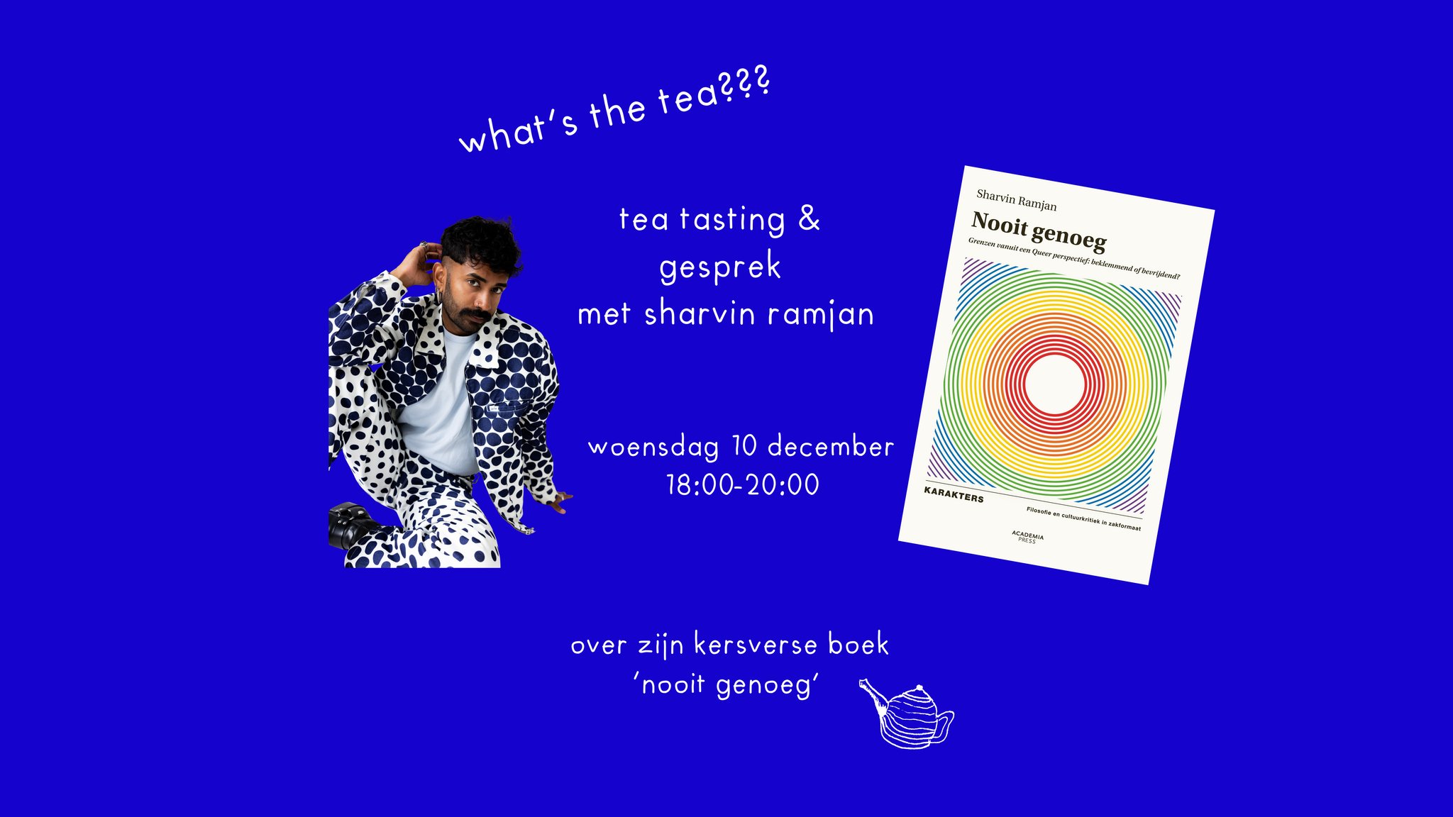 what’s the tea? op woensdag 10 december komt sharvin ramjan zijn kersverse boek ‘nooit genoeg’ voorstellen. aan de hand van een tea tasting duiken we samen in het boek! vanuit queer perspectief onderzoekt sharvin fysieke, relationele, emotionele en maatschappelijke grenzen. ready to spill some tea! schrijf je hier in: https://docs.google.com/forms/d/16xk1yvI9dqnFnwhUI-pFKd8ObU-4TL4KTtEVG1pmZm0/edit